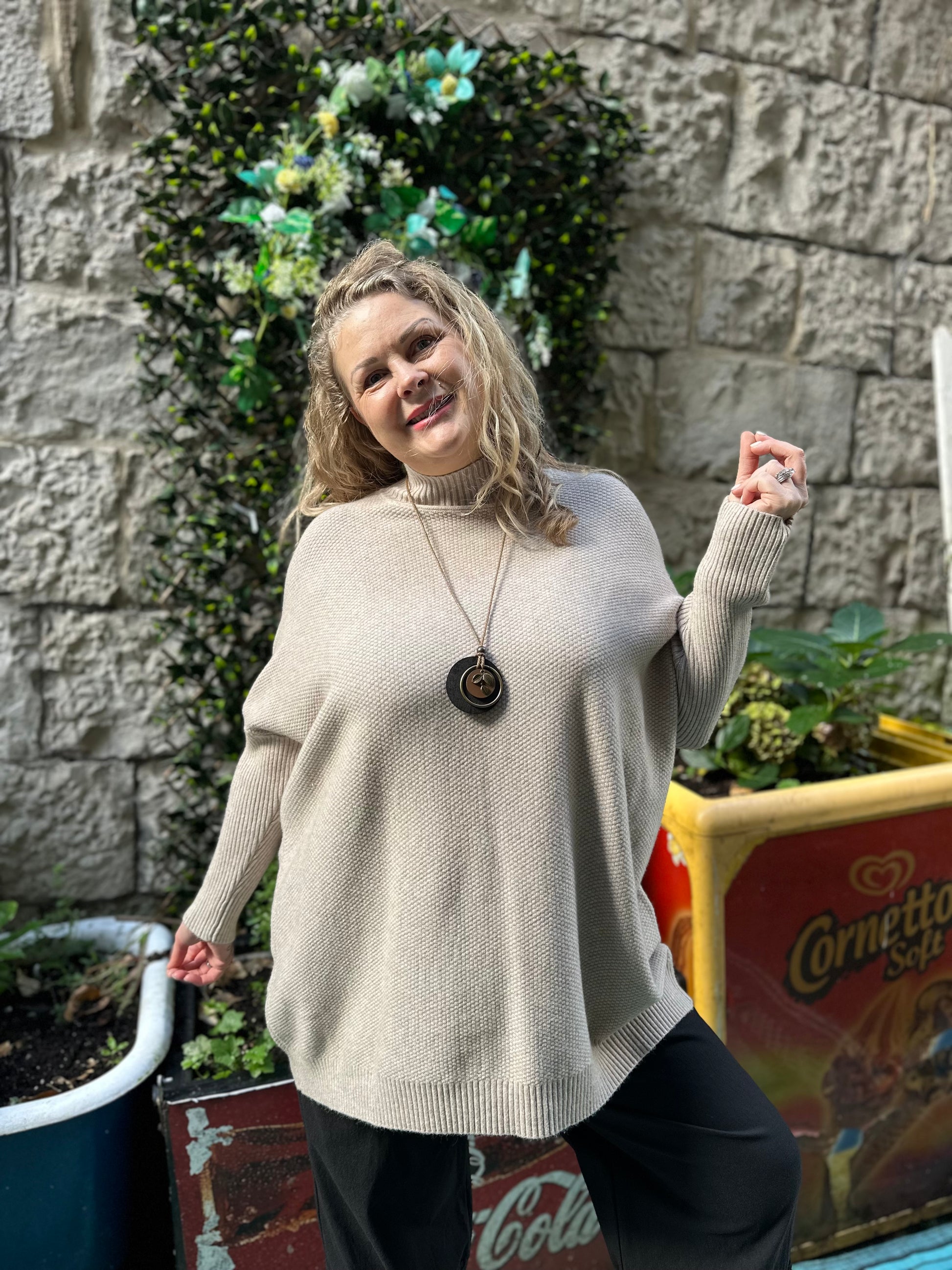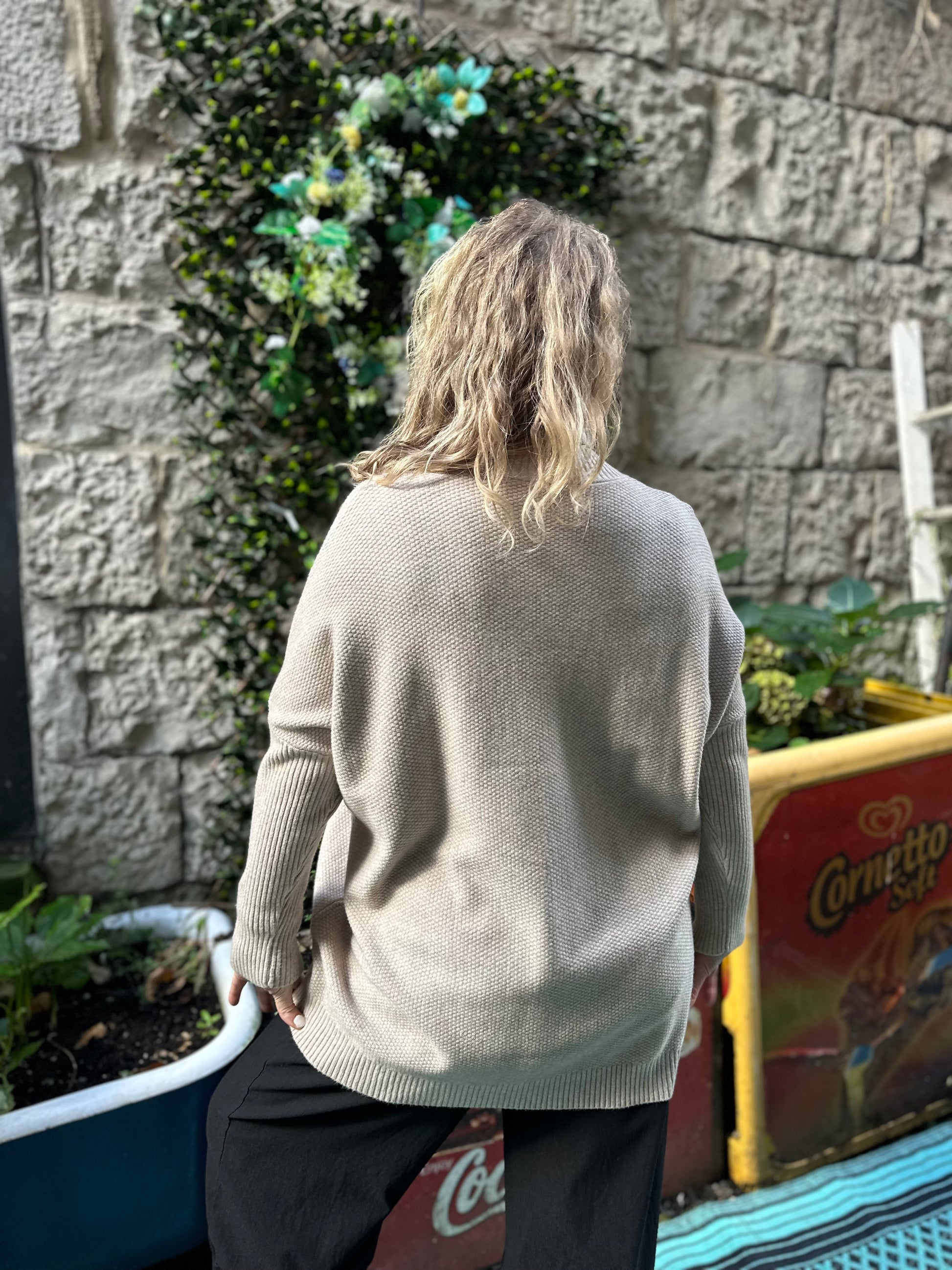 Super soft oatmeal waffle jumper, with ribbed long sleeves, hem and neckline.